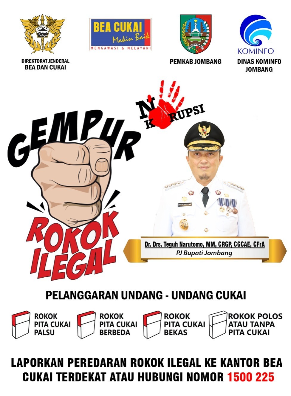 Pj Bupati Jombang Teguh Naruto Menghimbau masyarakat Jombang kalau melihat peredaran rokok ilegal segera melaporkan kekantor Bea Cukai terdekat atau Hubungi nomor 1500 225