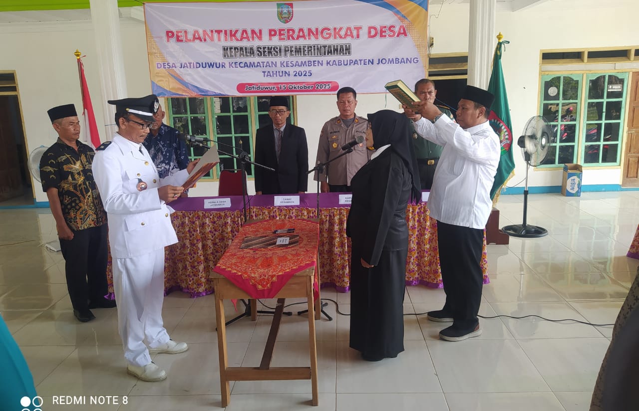 Jombang, mediarakyatpost.com– Pemerintah Desa Jatiduwur, Kecamatan Kesamben, Kabupaten Jombang, menggelar acara Pelantikan Perangkat Desa Roipah untuk jabatan Kepala Seksi Pemerintahan. Kegiatan berlangsung khidmat di Balai Desa Jatiduwur pada Rabu (15/10/2025), dengan dihadiri berbagai unsur pemerintahan dan tokoh masyarakat setempat.