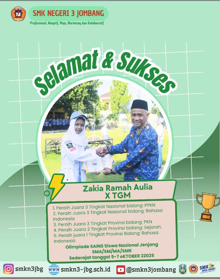 Kepala Sekolah SMK Negeri 3 Jombang, Drs. Khasanuddin, M.M.P mengatakan bahwa Siswi atas nama Zakia Ramah Aulia (kelas X TGM) telah meraih juara sains tingkat Nasional dan Provinsi diantaranya :